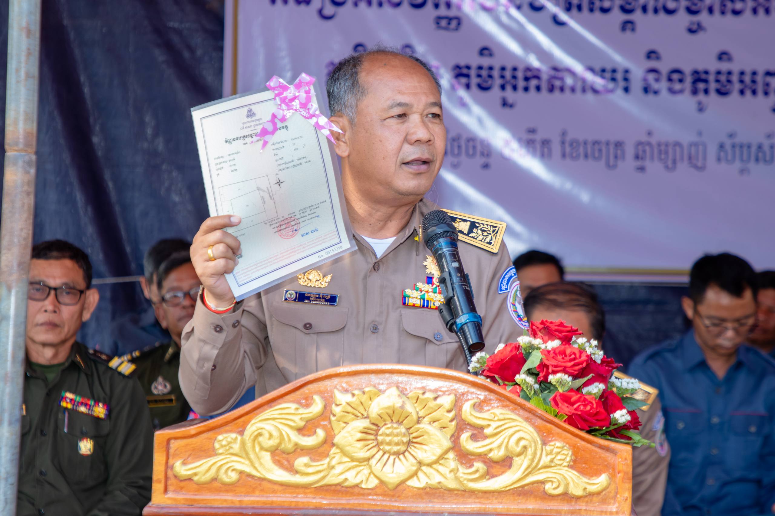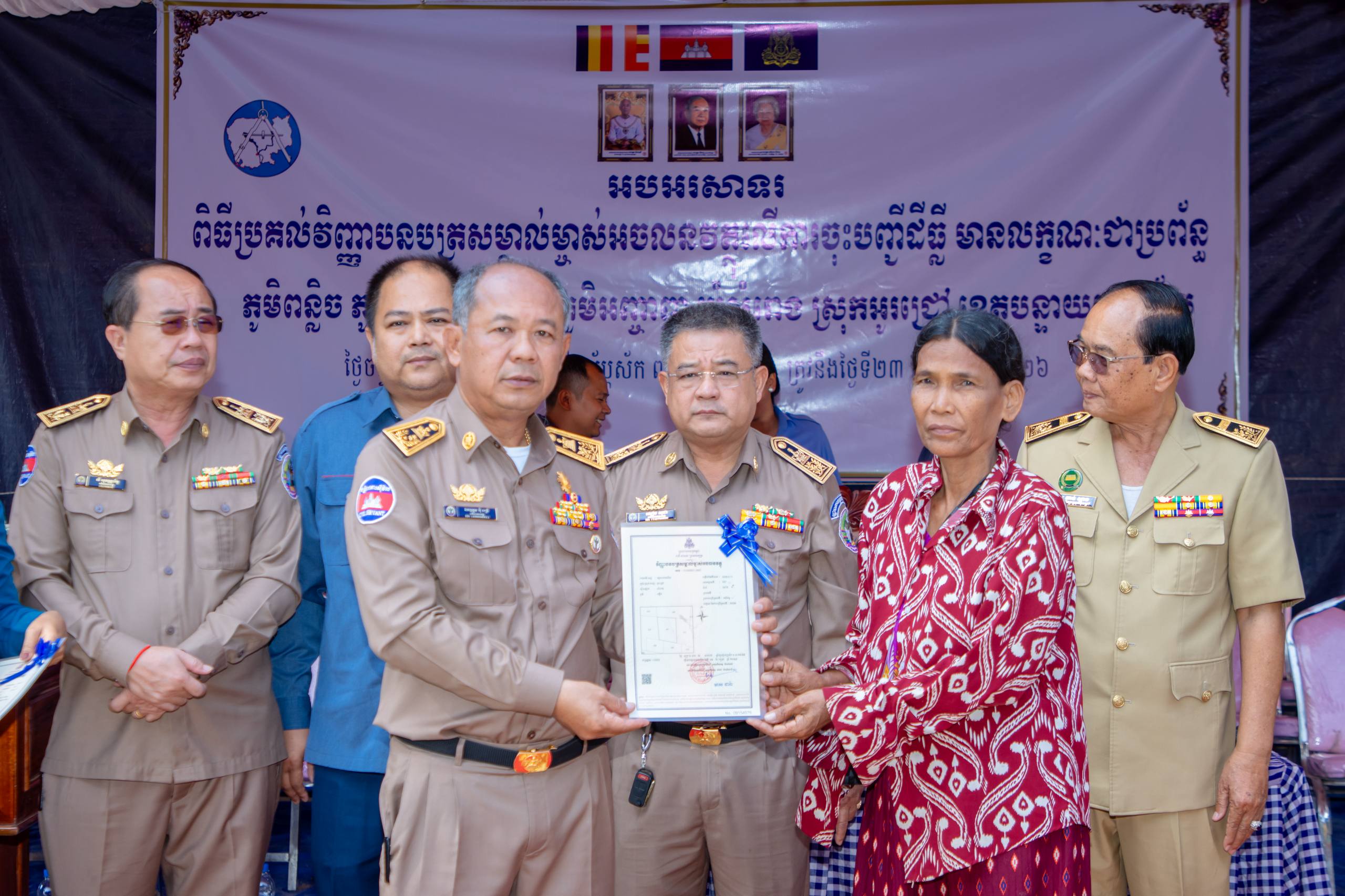 បន្ទាយមានជ័យ ៖ មន្ទីររៀបចំដែនដី នគរូបនីយកម្ម សំណង់ និងសុរិយោដីខេត្តបន្ទាយមានជ័យ និងរដ្ឋបាលបាលស្រុកអូរជ្រៅ បានរៀបចំពិធីចែកវិញ្ញាបនបត្រសម្គាល់ម្ចាស់អចលនវត្ថុ ក្នុងភូមិបន្លិច ភូមិអ្នកតាឈរ ភូមិអញ្ចាញ ឃុំសំរោង ស្រុកអូរជ្រៅ ខេត្តបន្ទាយមានជ័យ ស្មើនឹង ២ ៥៨១ បណ្ណ ស្ថិតនៅវត្តសំរោង ភូមិសំរោង ឃុំសំរោង ស្រុកអូរជ្រៅ ខេត្តបន្ទាយមានជ័យ ក្រោមអធិបតីភាព ឯកឧត្តម អ៊ុំ រាត្រី អភិបាលនៃគណៈអភិបាលខេត្តបន្ទាយមានជ័យ នៅថ្ងៃទី២៣ ខែមីនា ឆ្នាំ ២០២៦។